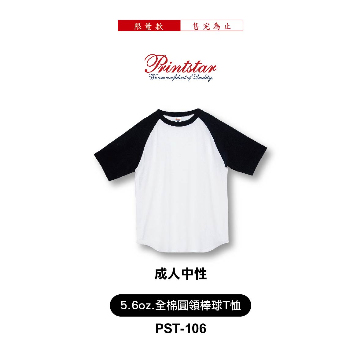 Printstar│5.6oz全棉圓領棒球T恤│PST-106