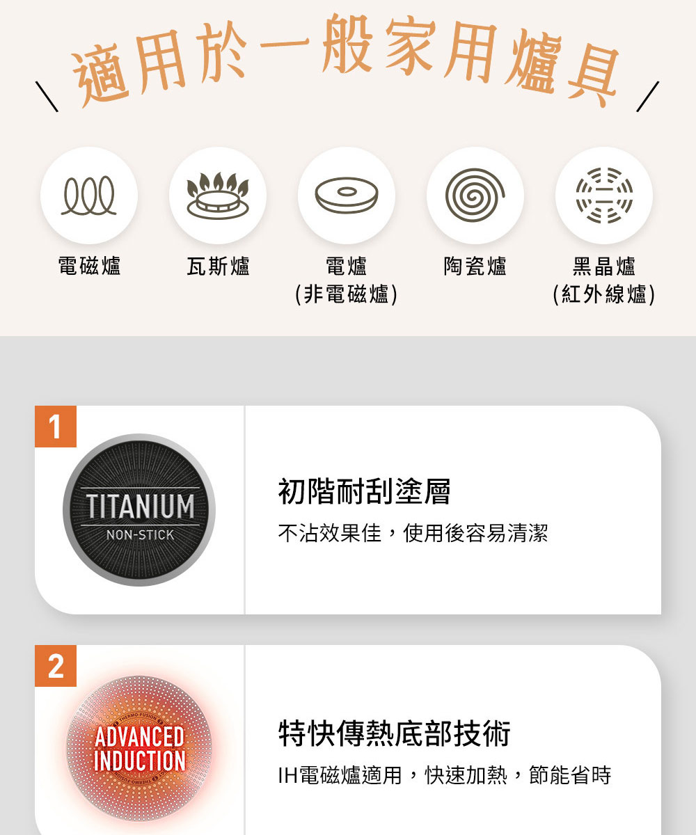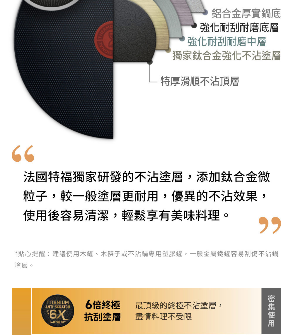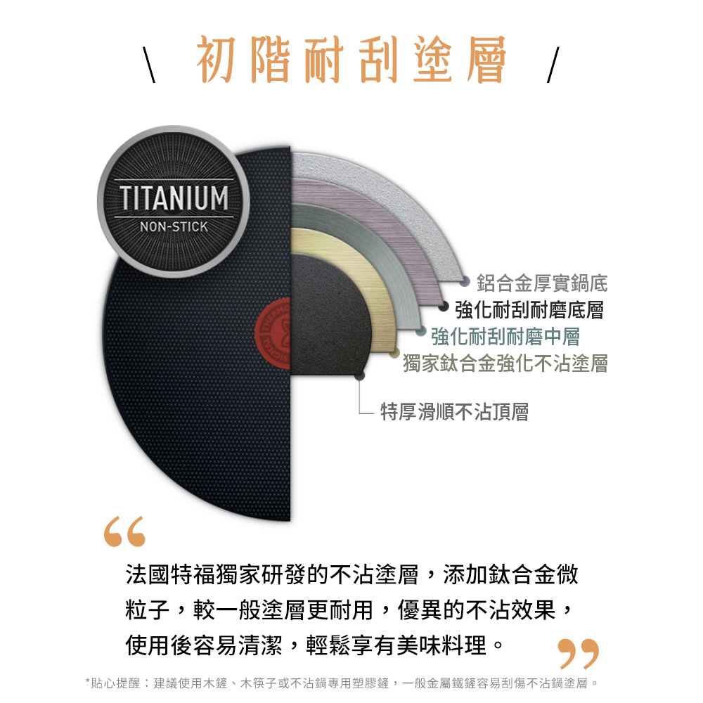 ◆TITANIUM鈦合金強化塗層,法國特福獨家研發塗層,添加鈦合金微粒子,優異的耐磨、抗刮性,不沾效果佳又好清洗。