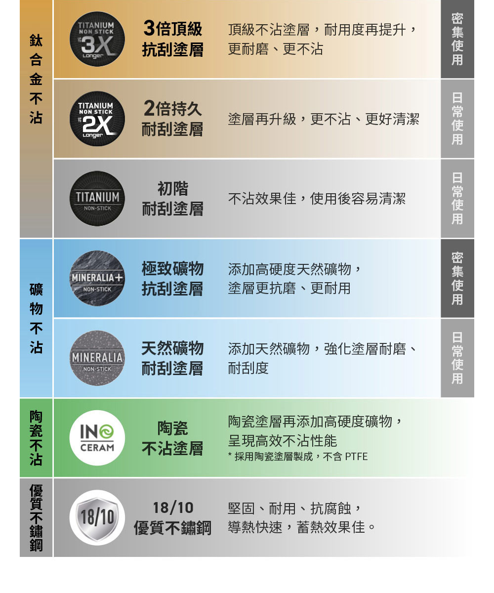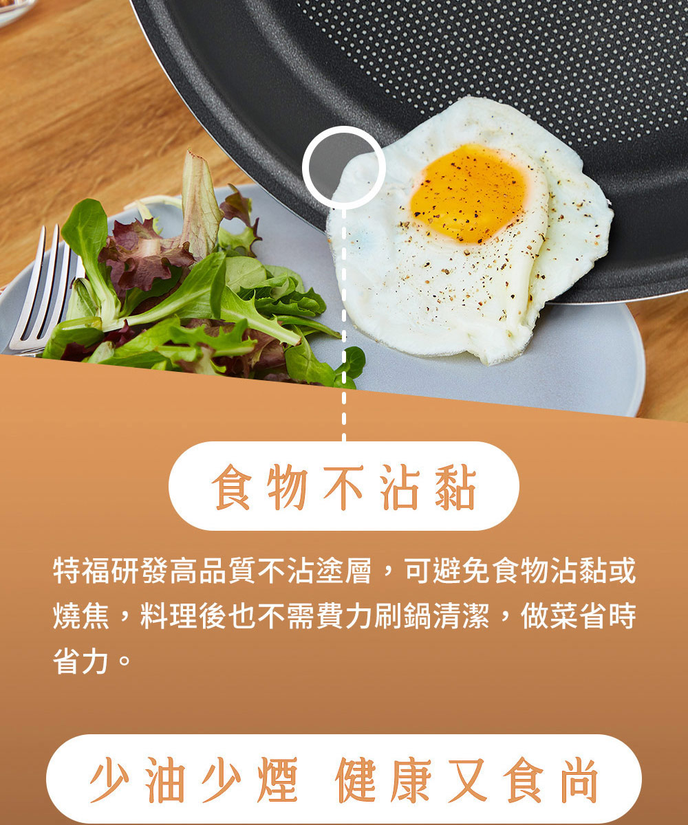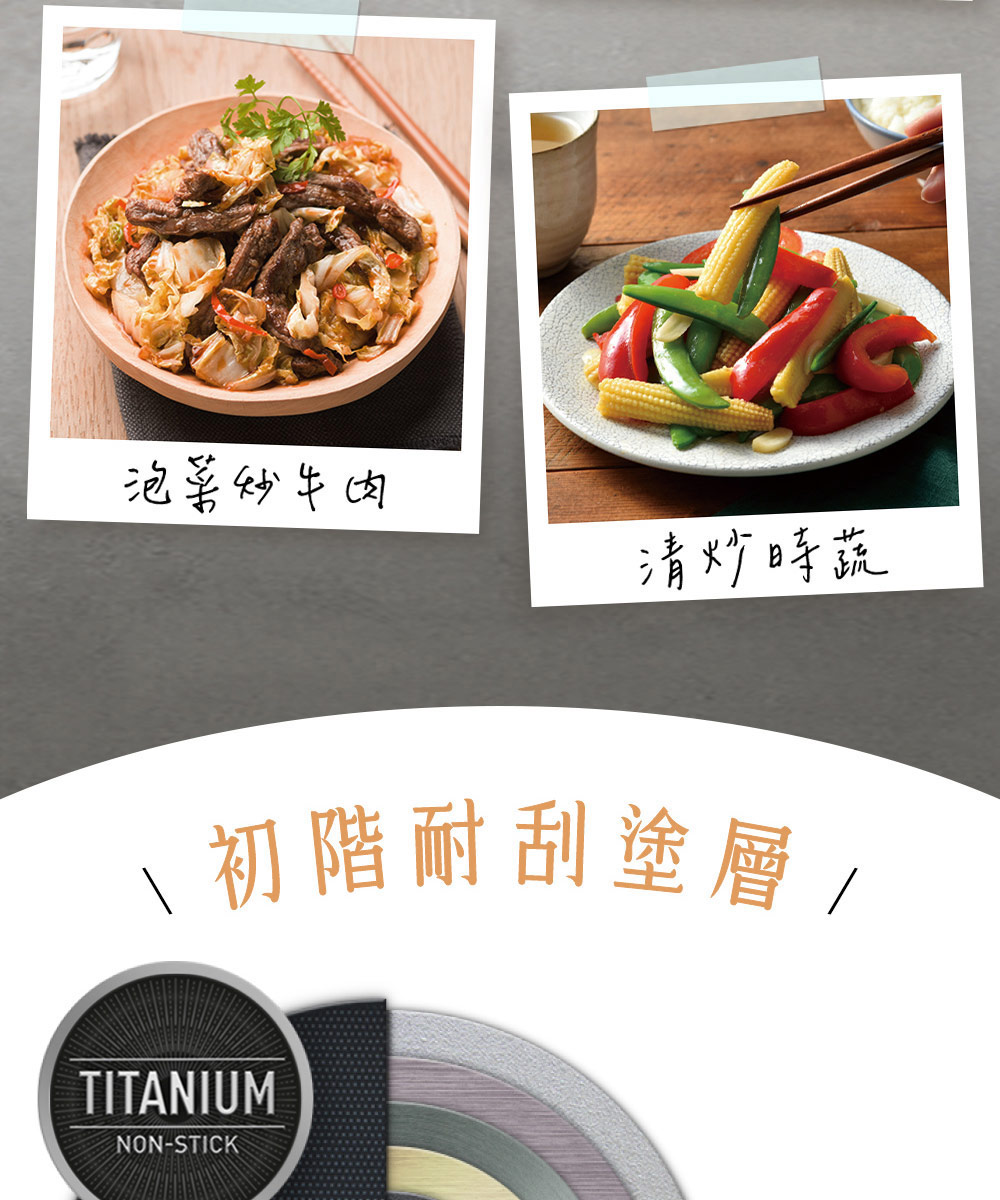◆TITANIUM鈦合金強化塗層,法國特福獨家研發塗層,添加鈦合金微粒子,優異的耐磨、抗刮性,不沾效果佳又好清洗。