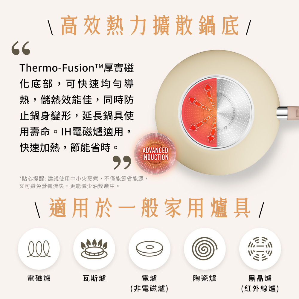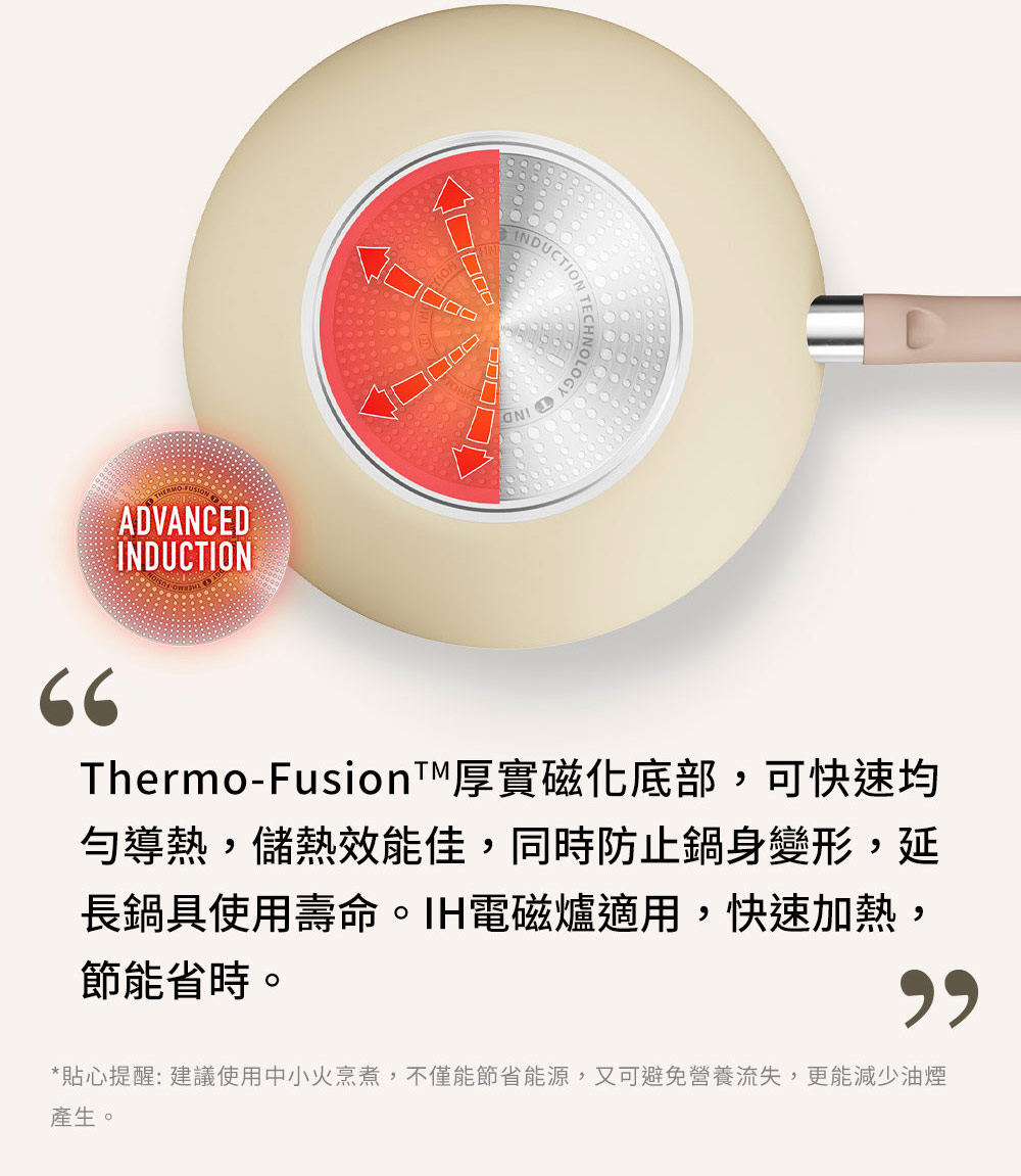 ◆Thermo-Fusion厚實磁化底部,IH電磁爐同樣快速加熱,儲熱效能佳,同時防變形、壽命更長。
