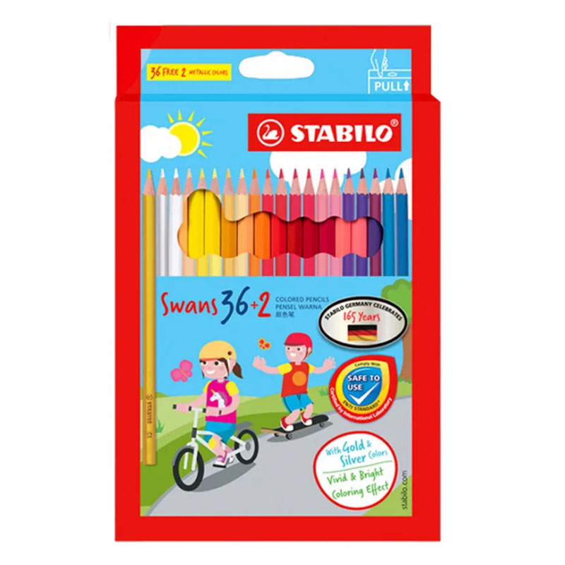 STABILO 思筆樂 Swans油性色鉛筆36+2色(ST1870/38) 規格:36+2 增加2支新的附加彩色鉛筆(金色及銀色) 單支筆長:175mm*2.7mm 包裝方式:環保紙盒