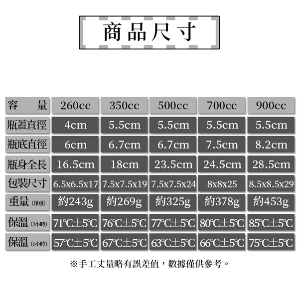 產品特色: ★內膽採最高等級316不銹鋼 ★具抗氧化、耐酸鹼的特性 ★運動瓶身設計,簡約時尚 ★窄口設計保溫、保冷效果更佳 ★貼心提把設計,外出攜帶更便利 ★小容量好攜帶,大容量滿足全家旅遊的需求 ★台灣製造