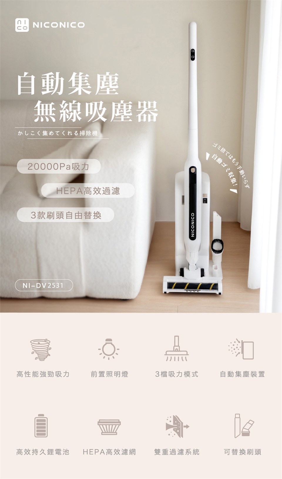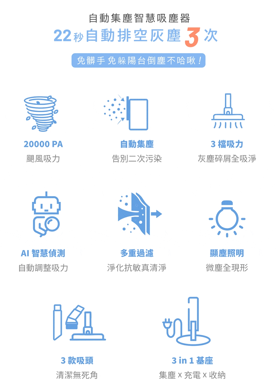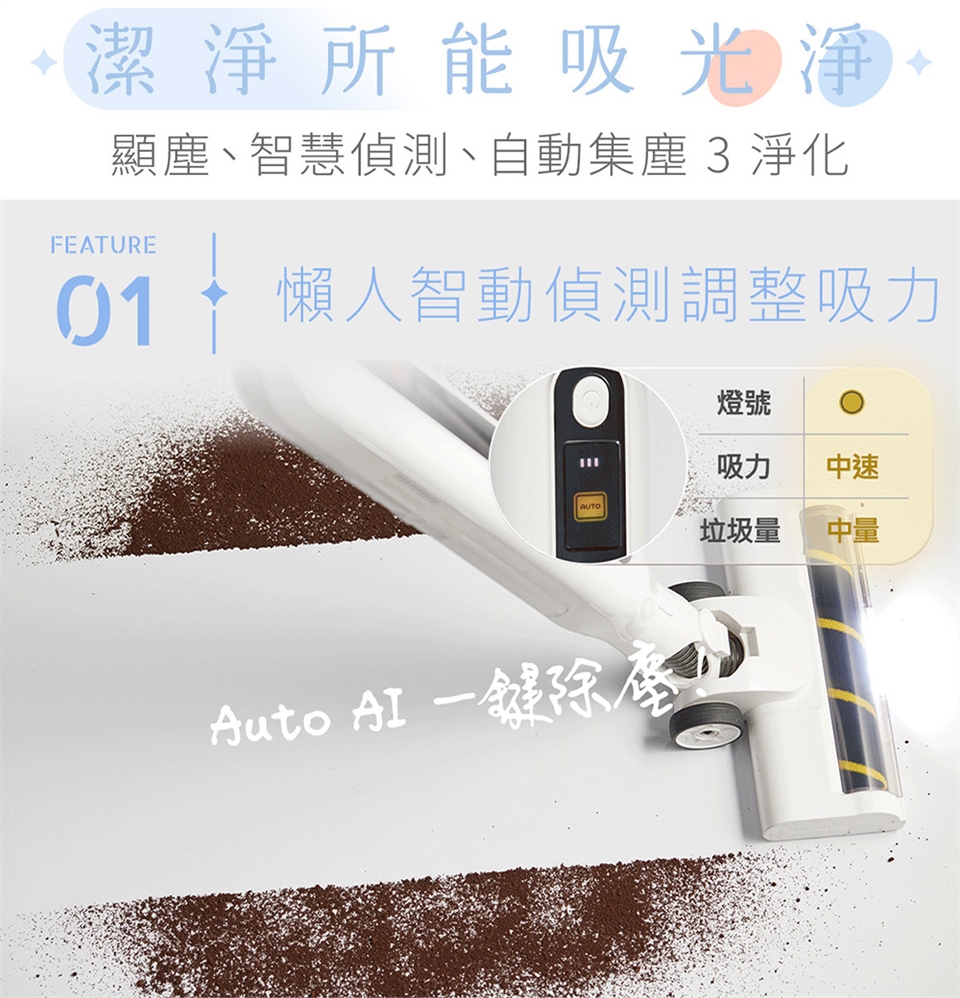 ▲無刷高速馬達,20Kpa強勁吸力 ▲自動集塵系統,塵不落地免沾手 ▲多重過濾系統,髒污層層分離 ▲3檔吸力模式,LED電量顯示 ▲電動絨毛地刷,清潔更省力 ▲無線設計自在吸塵不牽絆 ▲三款刷頭,靈活搭配運用 ▲充電x收納x集塵,專屬底座