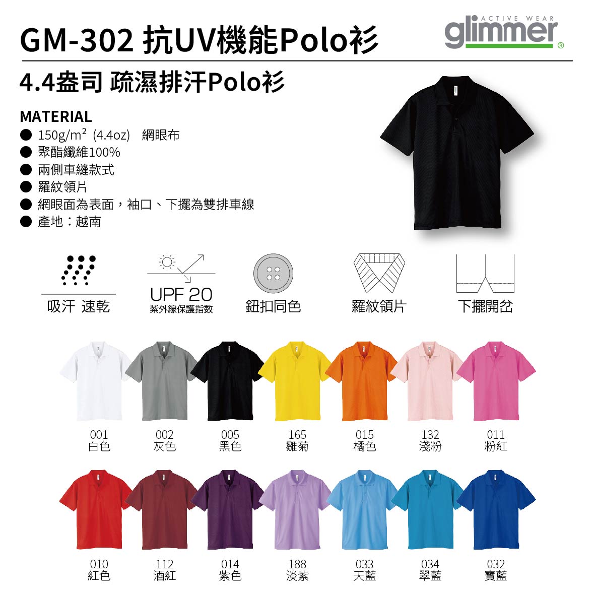 ★ GM-302 ★ 4.4oz.抗UV機能排汗Polo衫 ★ 100%聚酯纖維 ★ 五件起訂(貼身衣物如未確單恕不接受套量) ★ 客製化費用另計,歡迎來圖詢問 ★ 訂購前請詳閱訂購流程及注意事項 ★ 同款式衣服(空衣不含加工費用)不滿5000元需自付運費