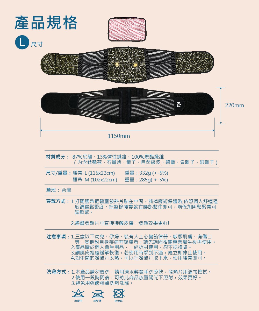 材質/成分/營養標示:87%尼龍、13%彈性纖維、100%聚酯纖維(內含鈦赫茲、石墨烯、量子、自然磁波、碧璽、負離子、銀離子)